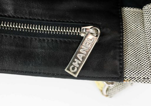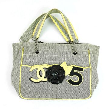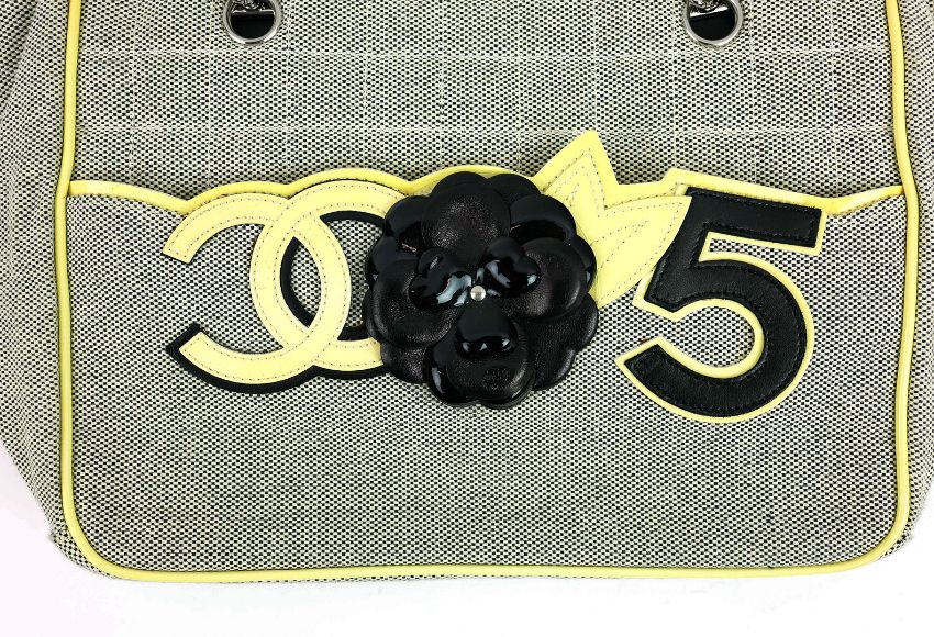 CHANEL CC NO.5 CHOCOLATE BAR CAMELIA FLOWER CHAIN BAG. canvas and leather, fabric lining, with internal leather flap with magnetic closure, code 10530937, 30cm x 19cm H x 12cm.