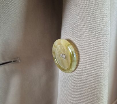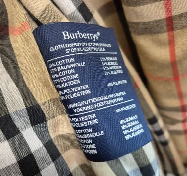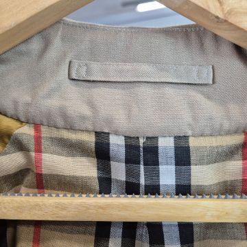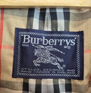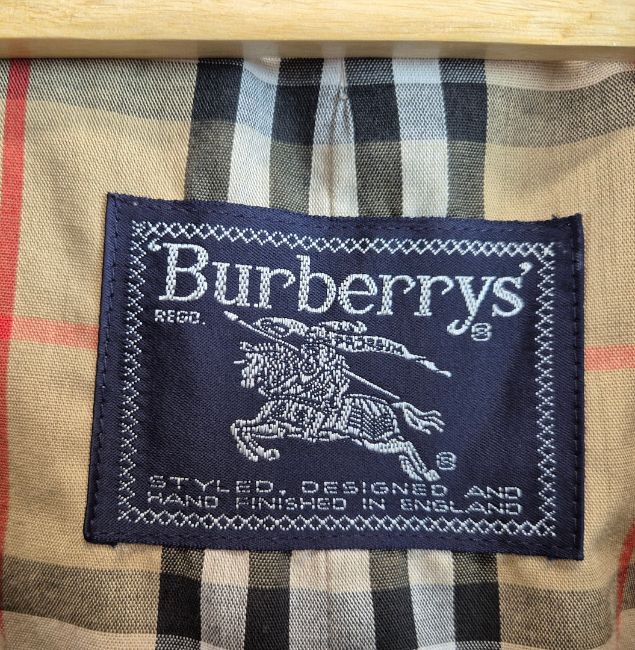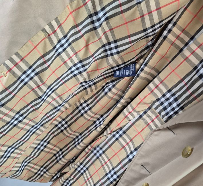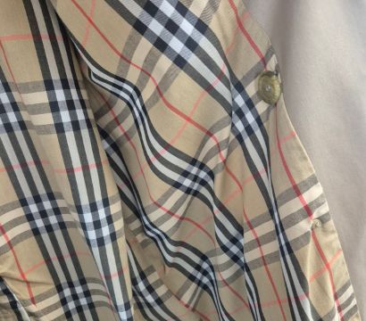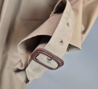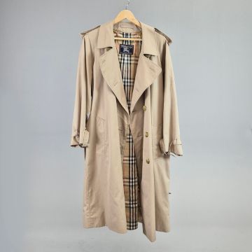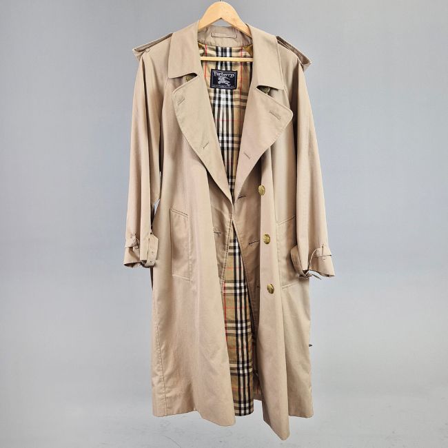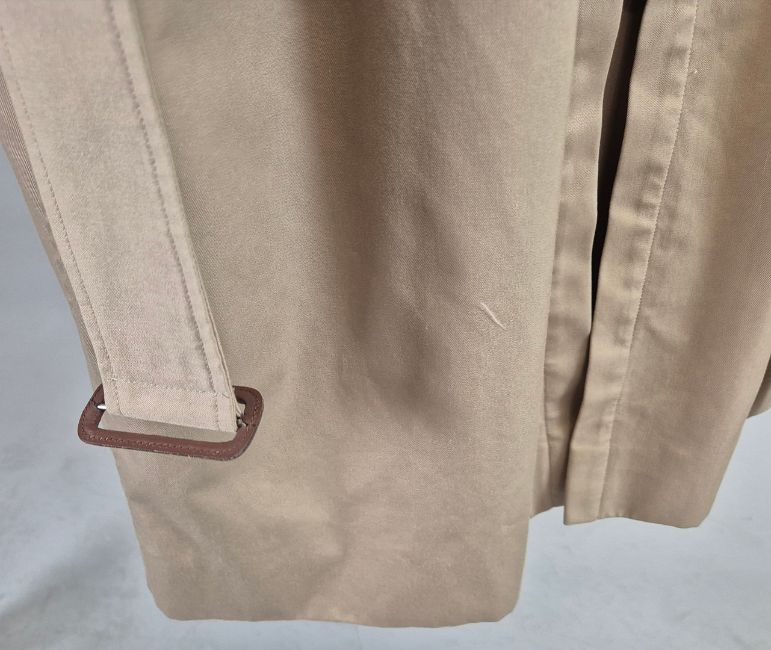 VINTAGE BURBERRYS TRENCH COAT. signature details (epaulettes, gun flap, belted cuffs, flap pockets, belt, check lining) double breast closure, cotton, made in England, possibly size 14.