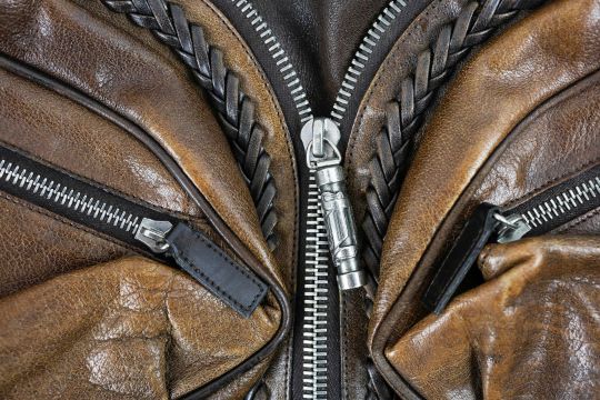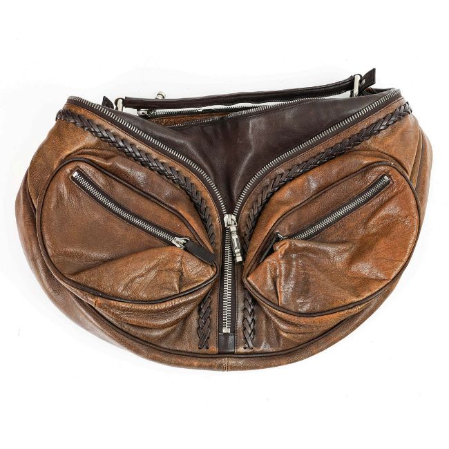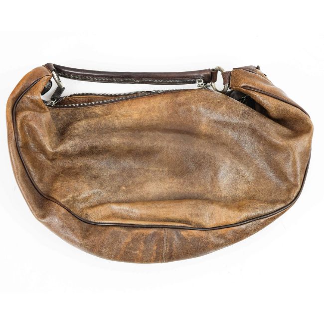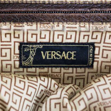GIANNI VERSACE VINTAGE GOTHIC DM SHOULDER BAG. leather with fabric lining, zip decoration, main compartment and two further front pockets, 46cm tot length x 26cm at tallest.