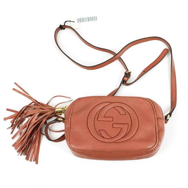 GUCCI SOHO DISCO BAG. raspberry colour leather with fabric lining, gold tone hardware, 22cm x 5cm x 14cm H.