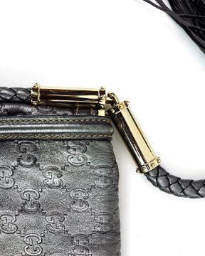 GUCCI BRITT SILVER GUCCISSIMA LEATHER TASSEL BAG. pale gold tone hardware, fabric lining, magnetic front flap closure with dust bag, 24cm x 29cm H.
