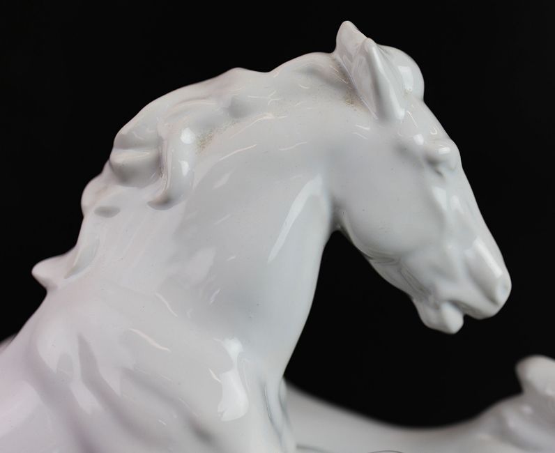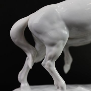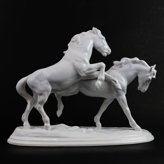 A KERAMOS PORCELAIN HORSE FIGUREGROUP. early 20th century, made in Austria, in the form of two galloping horses, in white glaze finish, raised on a plinth base, stamped to underside, 36cm high, 46cm long, 17cm deep.