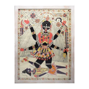 INDIAN SCHOOL. KALI THE BLACK GODDESS OF DAKSHINESWAR. gouache on fabric, 81cm x 61cm, framed.