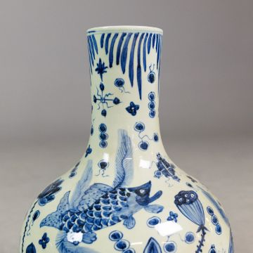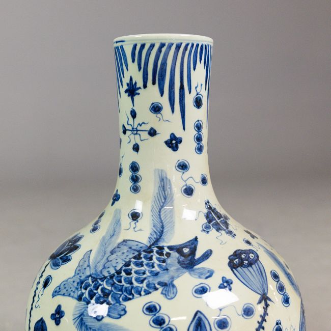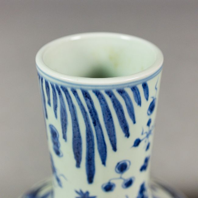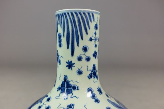PAIR OF CHINESE BLUE AND WHITE CERAMIC BOTTLE NECK VASES. 60cm H x 36cm W.