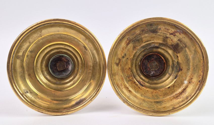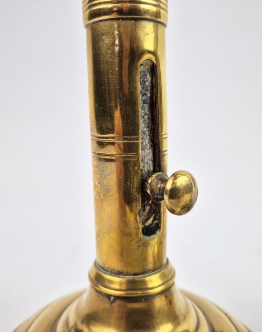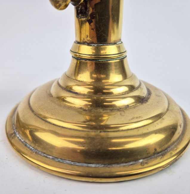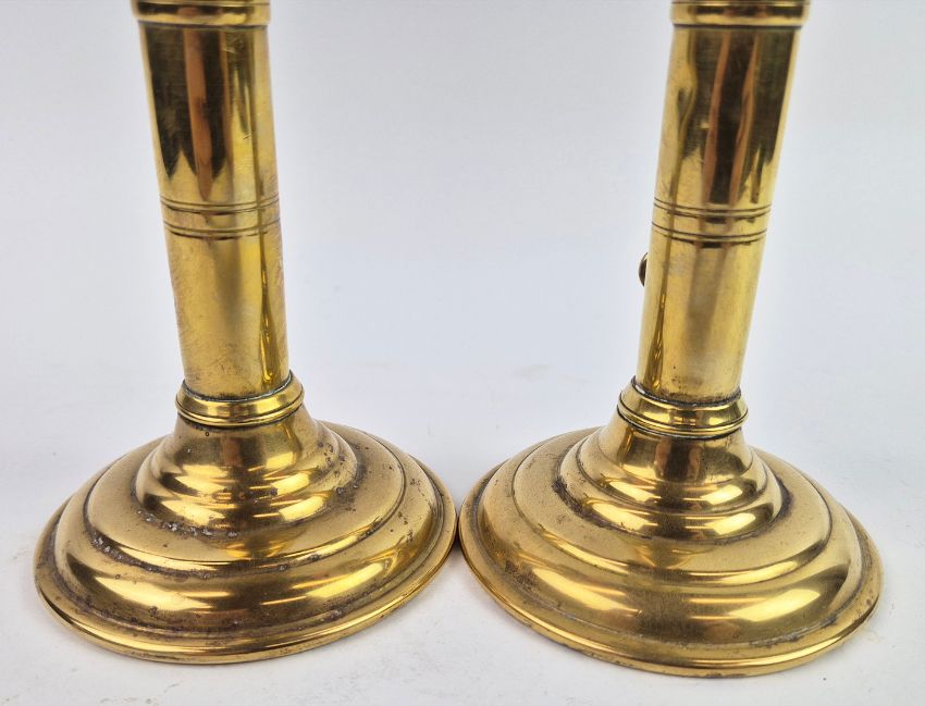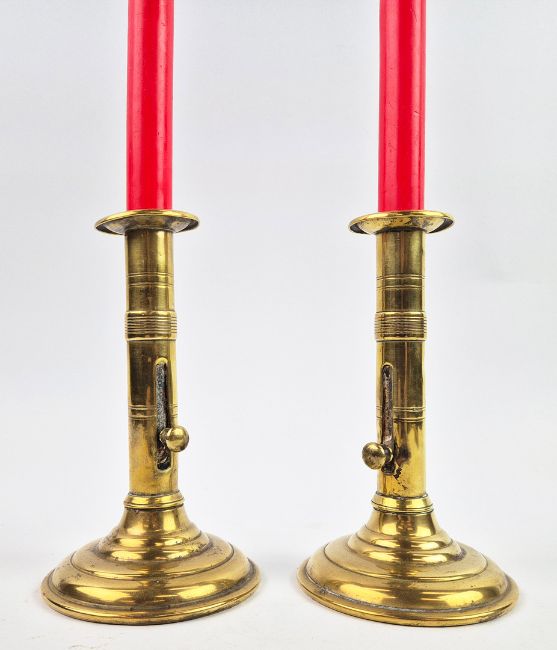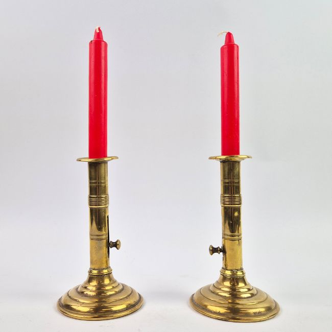 A PAIR OF 18TH/19TH CENTURY BRASS EJECTOR CANDLESTICKS (2). Each 18 cm H. with red candles (2).