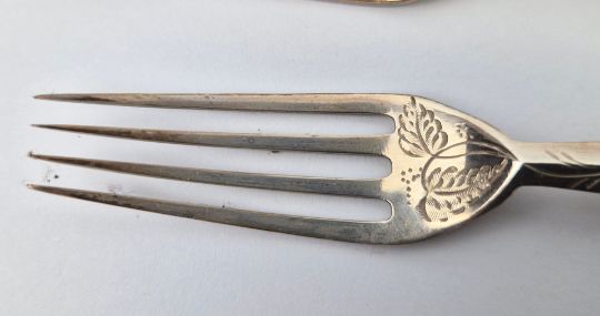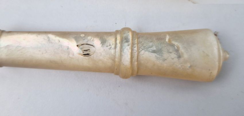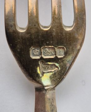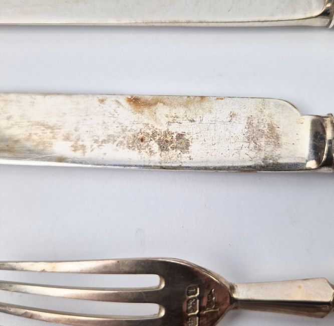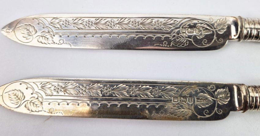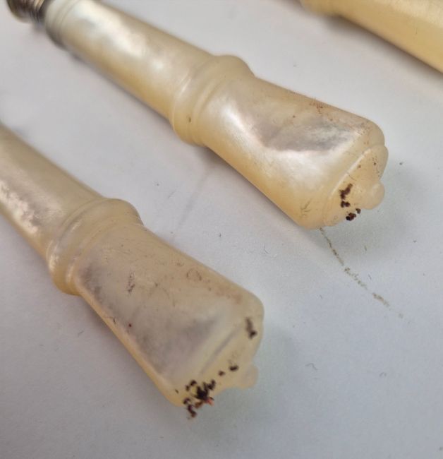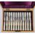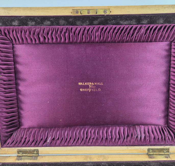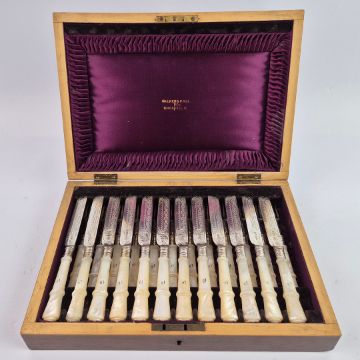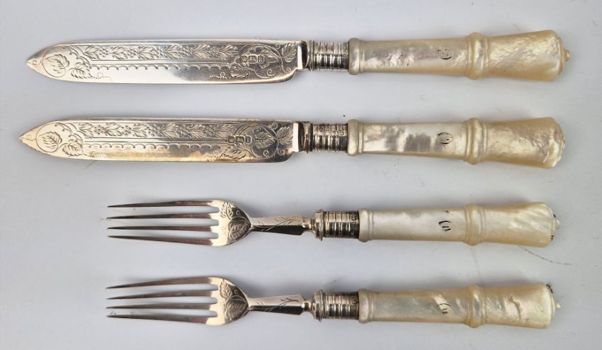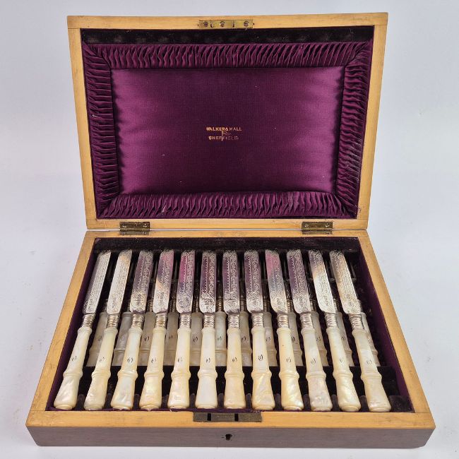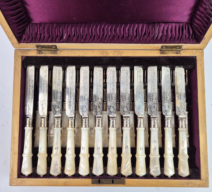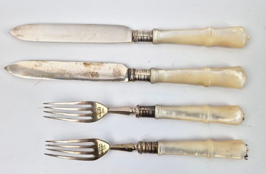 A WALKER AND HALL SET OF SILVER AND MOTHER-OF-PEARL HANDLED FRUIT KNIVES AND FORKS. Boxed with burgundy silk lining. A place setting for twelve, Sheffield, 1902.