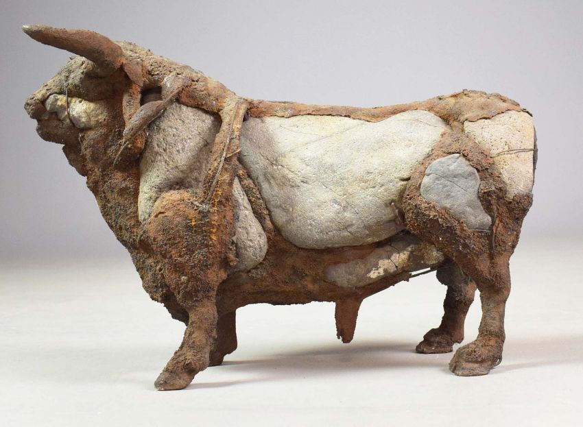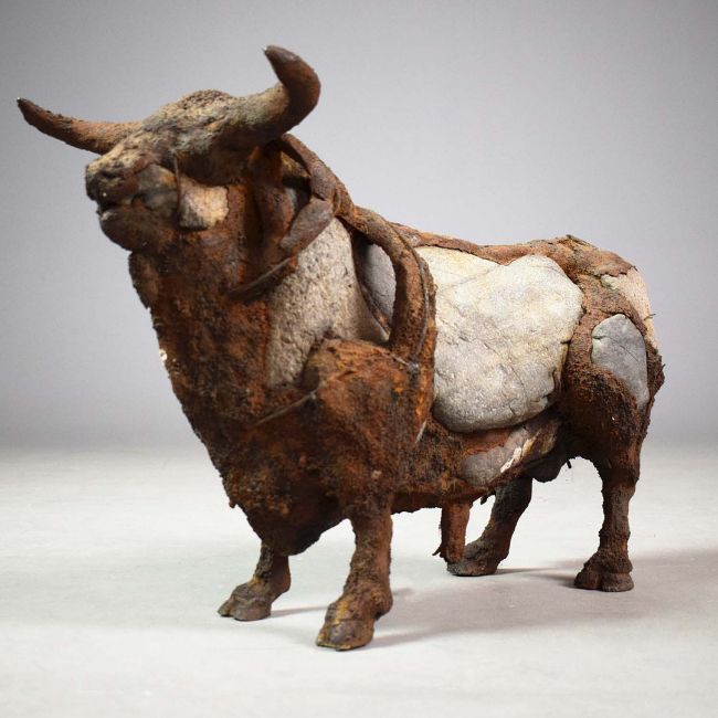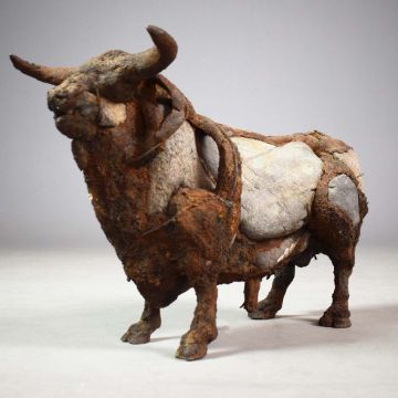 PALOLO VALDES (CHILEAN, B.1956). TORO PIERRE VALIENTE. Bronze, metal and stone sculpture. 42cm H x 67cm L.