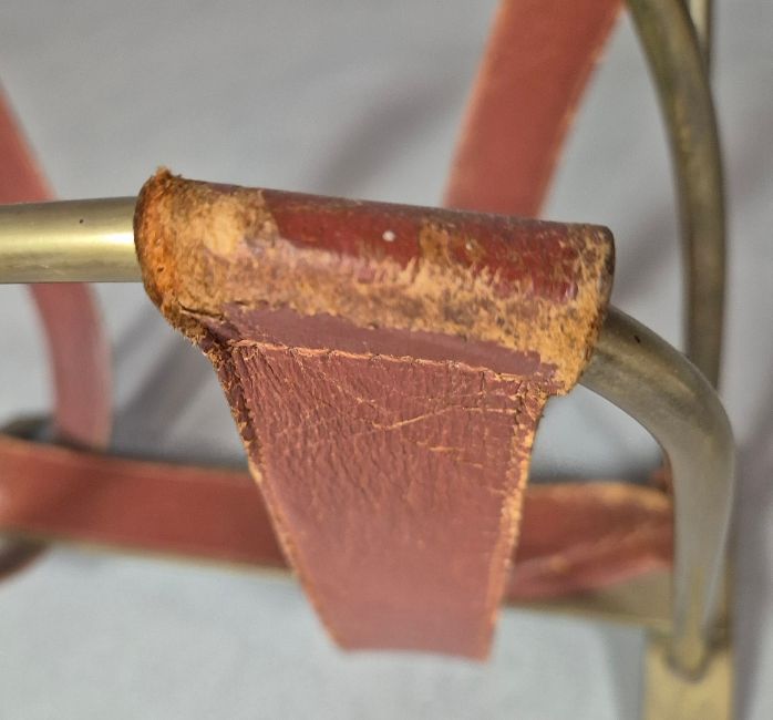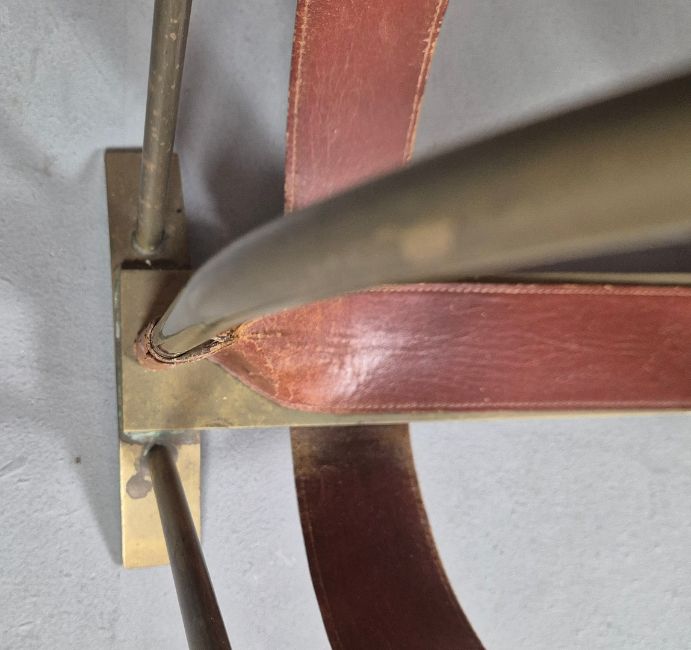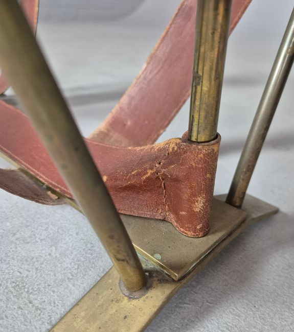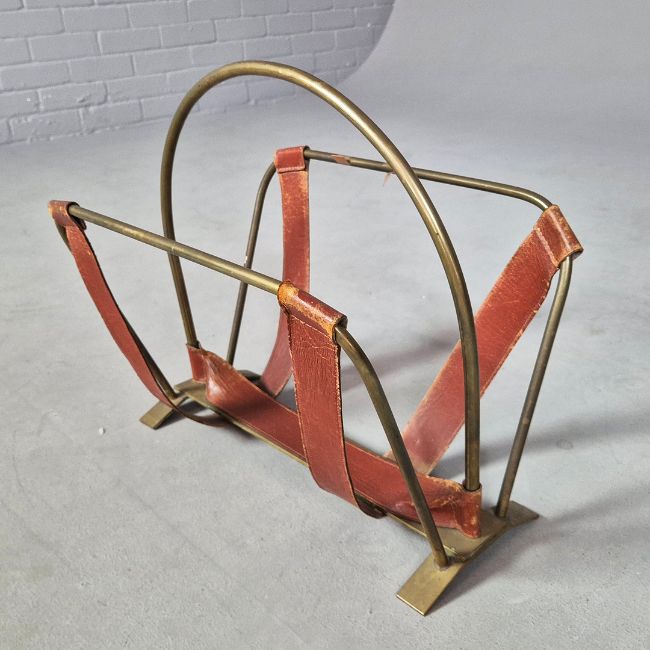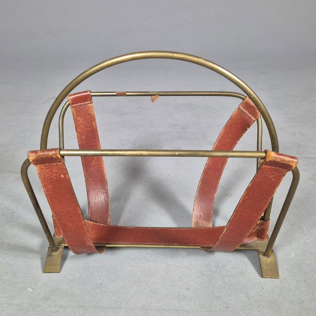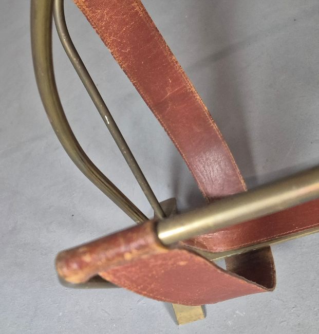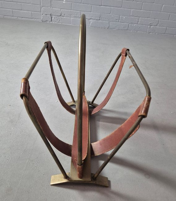 MAGAZINE RACK. leather and brass 43cm w x 43 cm t x 30cm d.