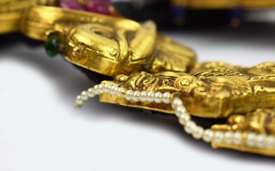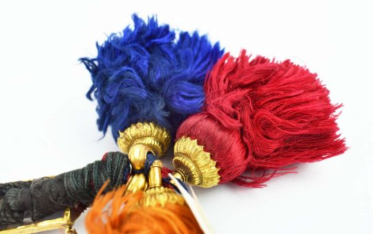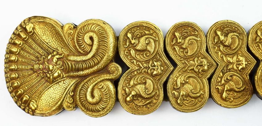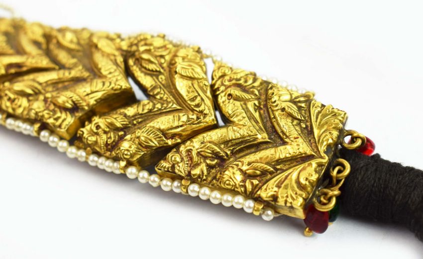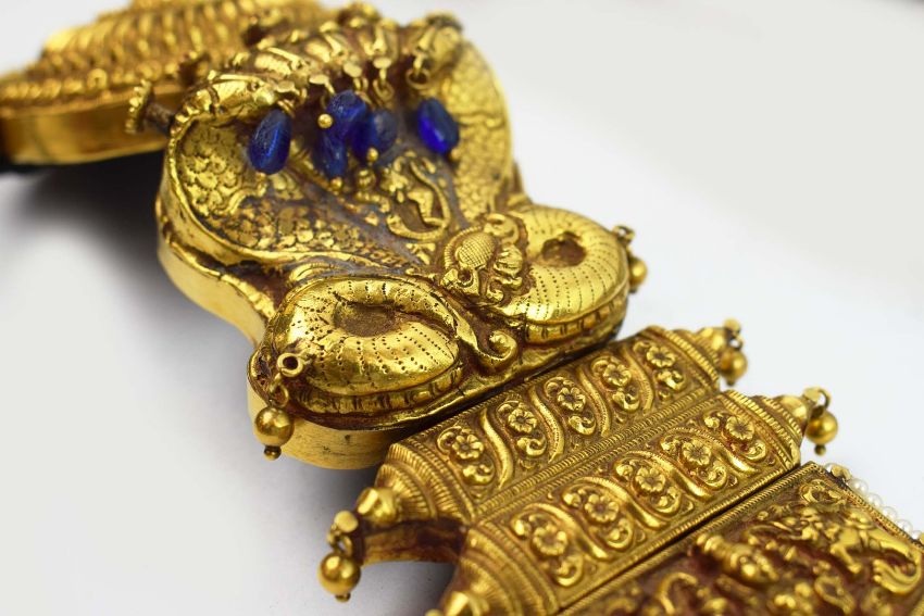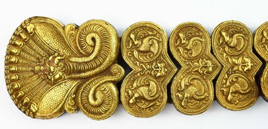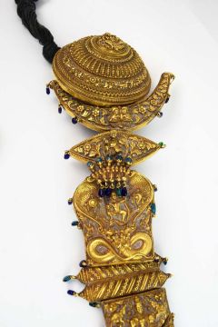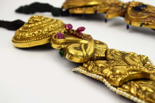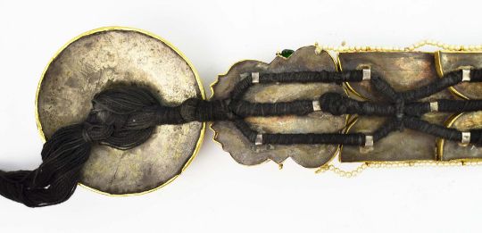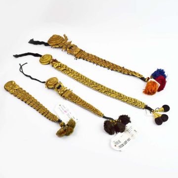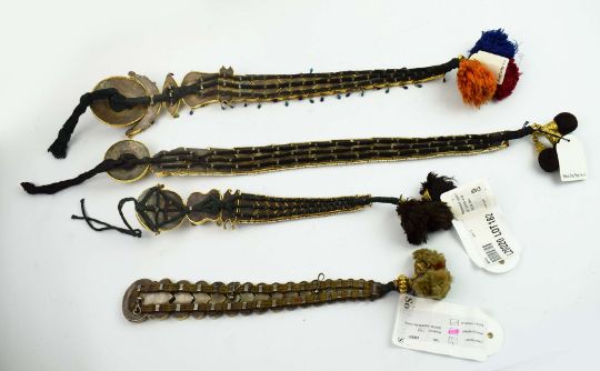 A COLLECTION OF FOUR INDIAN JADAI NAGAM GOLD HAIR BRAIDS. (4). 19th Century repousse sheet gold. adorned with cobras, lions and semi-precious stones with gold mounted tassels. 65cm.