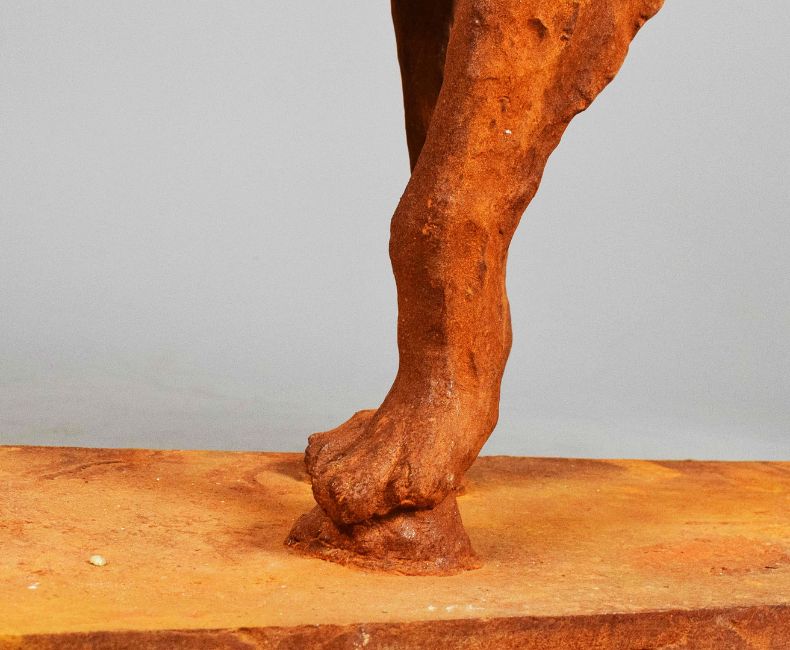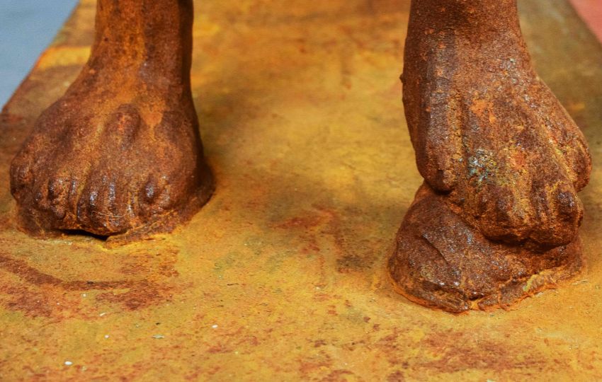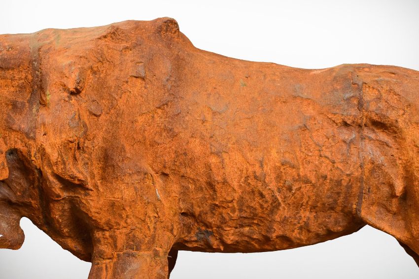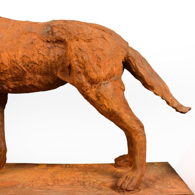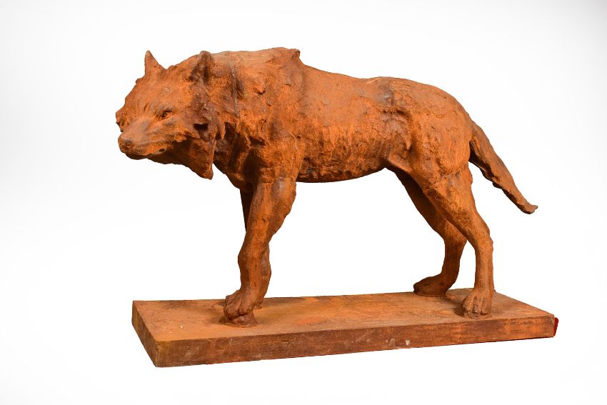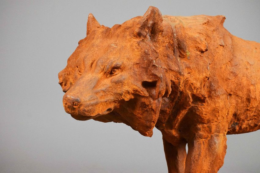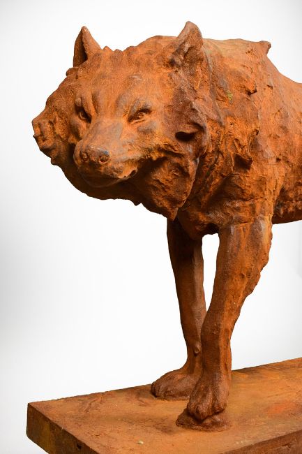 CONTEMPORARY SCHOOL SCUPTURAL STUDY OF A WOLF. cast metal, oxidised finish, 140cm L approx.