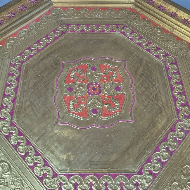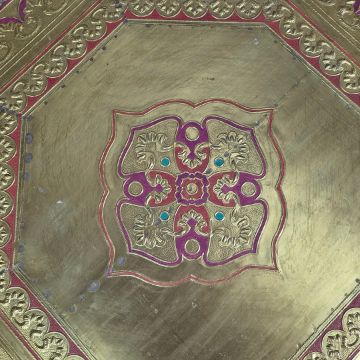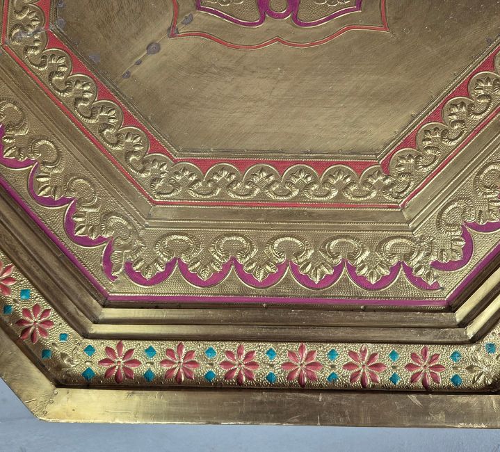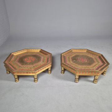 INDIAN STYLE LOW TABLES, A NEAR PAIR. wooden with applied gilt metal repousse and painted finish, 99cm diam. x 26cm H approx. (2).