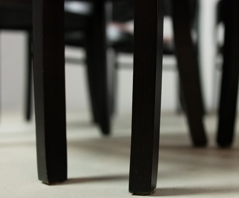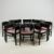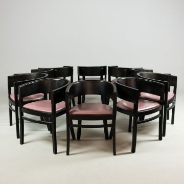 DINING CHAIRS (10). a set of ten, ebonised with plum leather seats.
