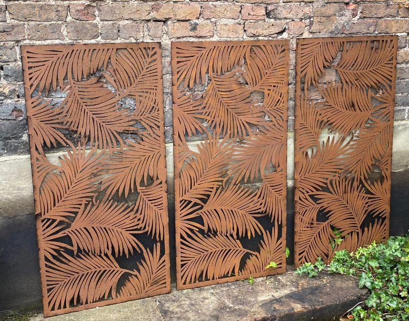 SET OF THREE PALM LEAF DESIGN GARDEN WALL PANELS. oxidised metal, 120cm H x 60cm W.