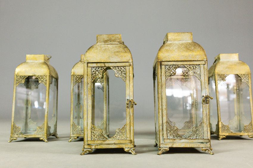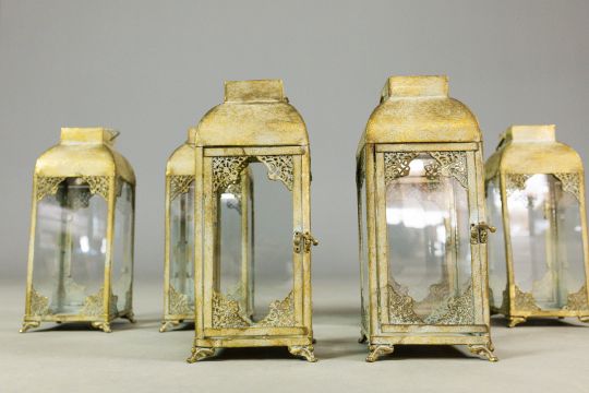 STORM LANTERNS, A SET OF 6. gilt metal and glazed, 37.5cm H approx. (6).