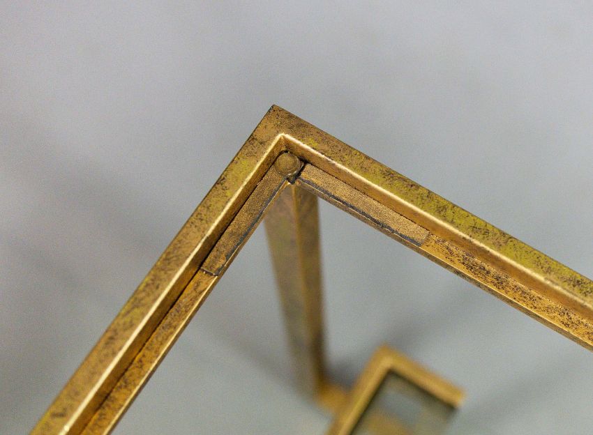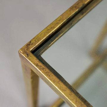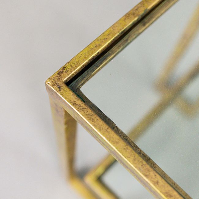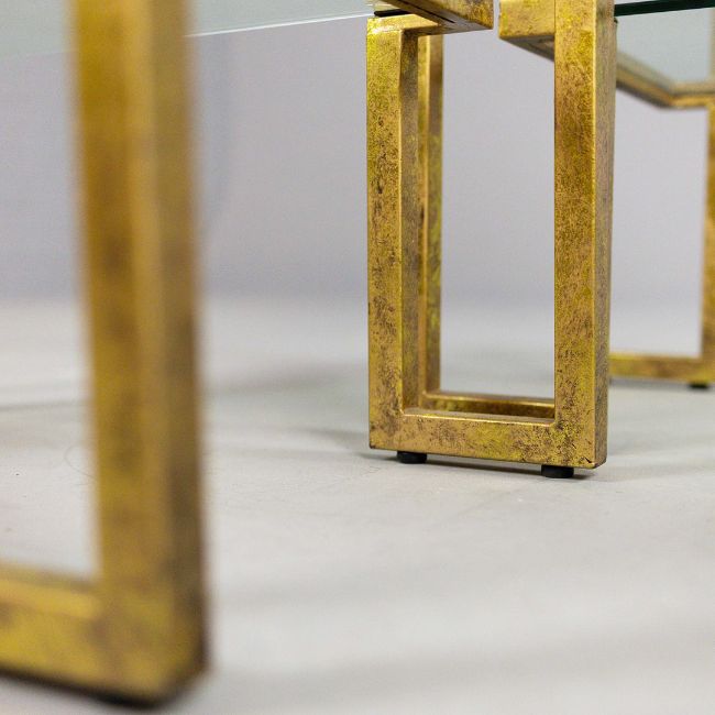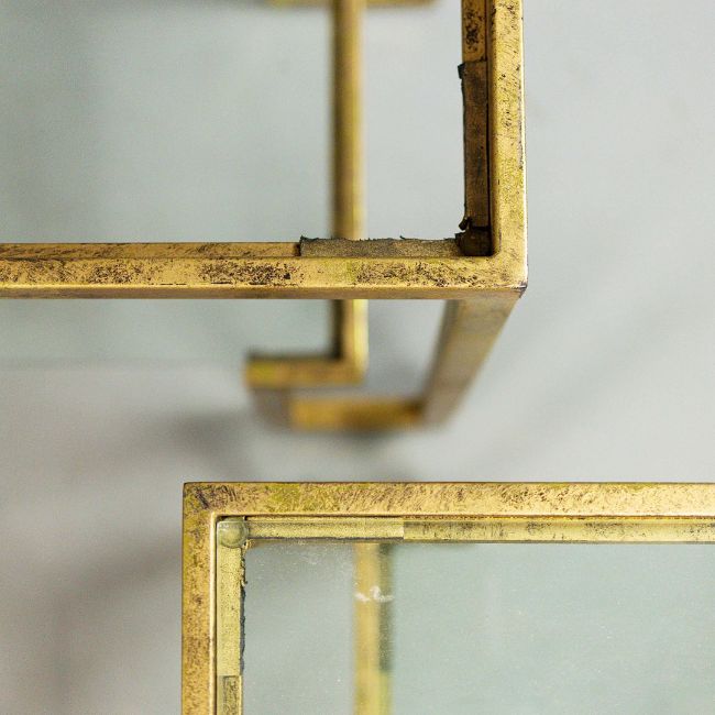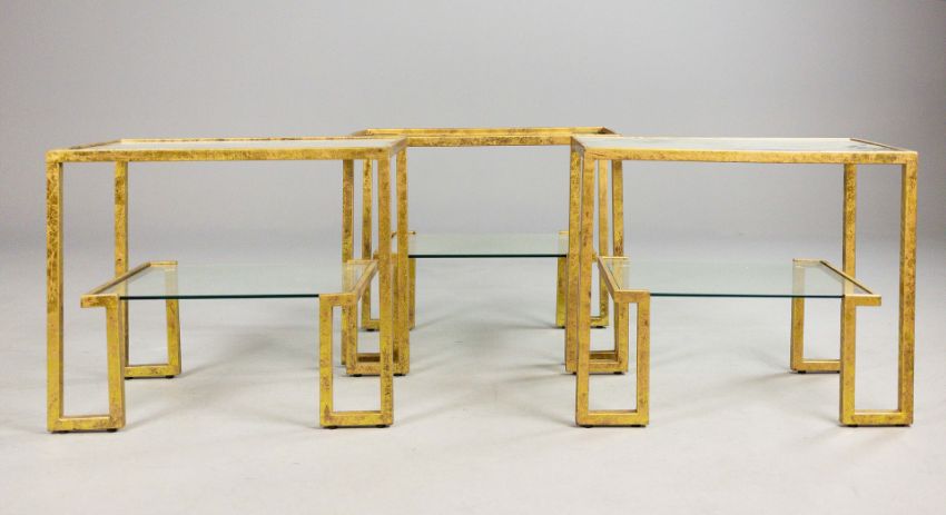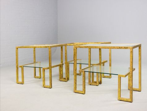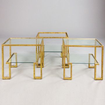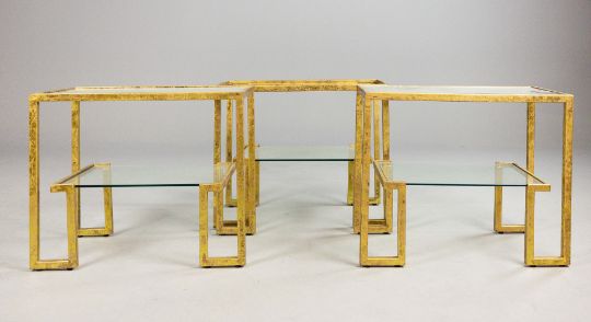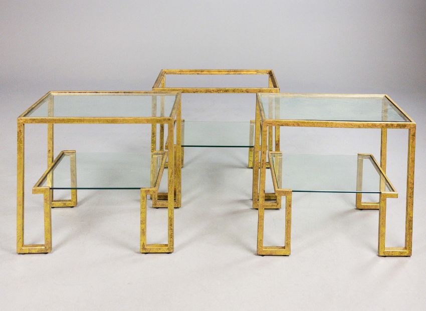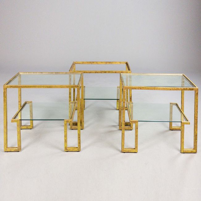 AURA LONDON SIDE TABLES, A SET OF THREE, GLASS AND GILT METAL. (3). 72cm x 40.5cm x 61.5cm approx. (3).
