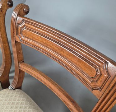 EIGHT REGENCY MAHOGANY DINING CHAIRS (8). comprising two pairs with, peach seats, 84cm H x 49cm W, and a set of four with cream seats, 82cm H x 48cm W.