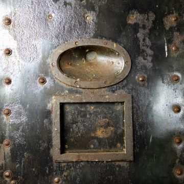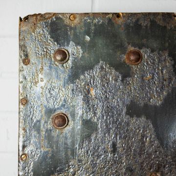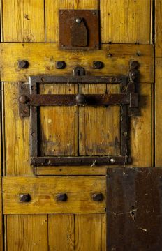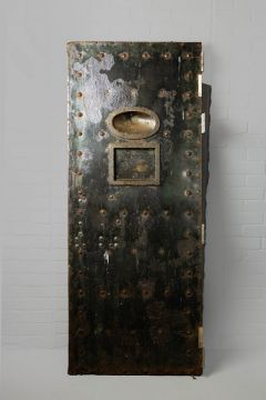 A 19TH CENTURY PRISON DOOR. believed to have been taken from Wentworth Prison, iron bound, solid pine frame, 182cm high, 73cm wide.
