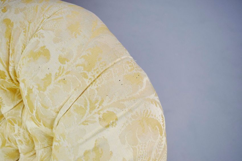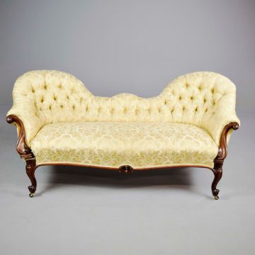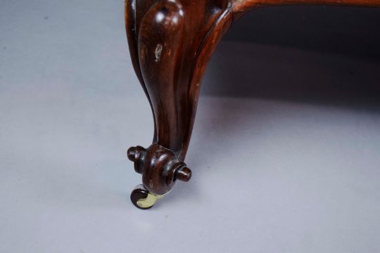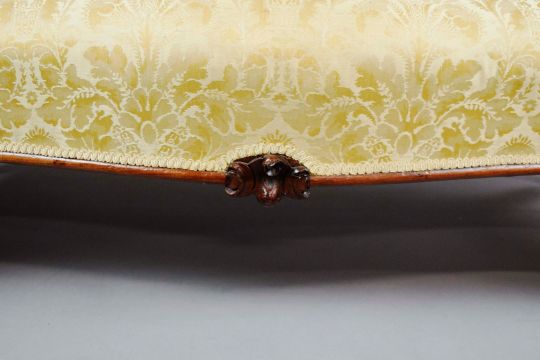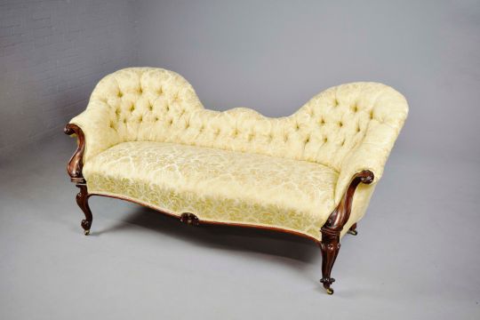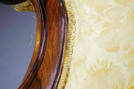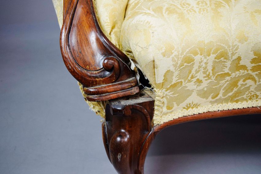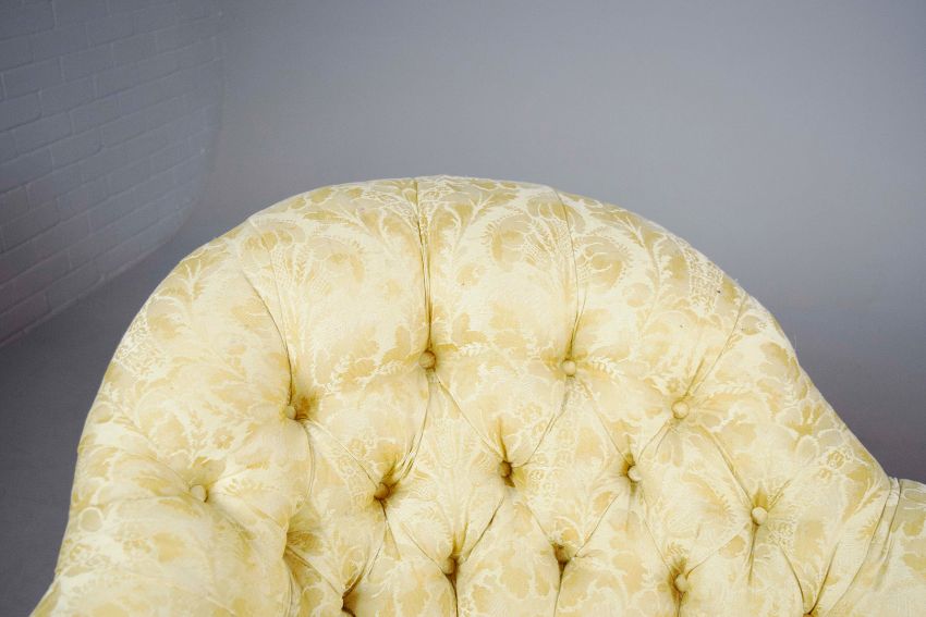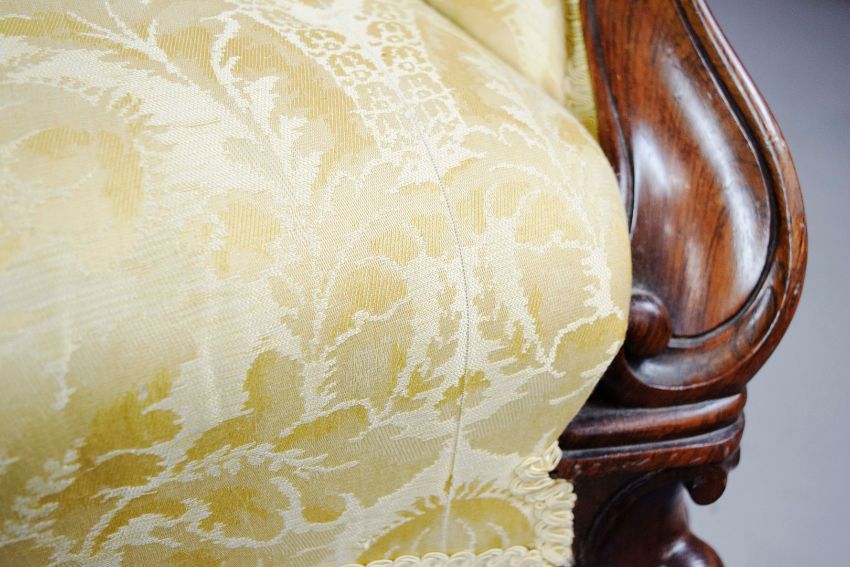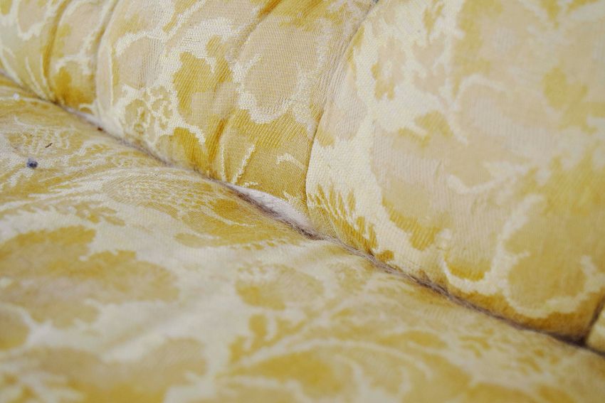 MID VICTORIAN ROSEWOOD SOFA. yellow damask on castors, 88cm H x 196cm W x 87cm D.