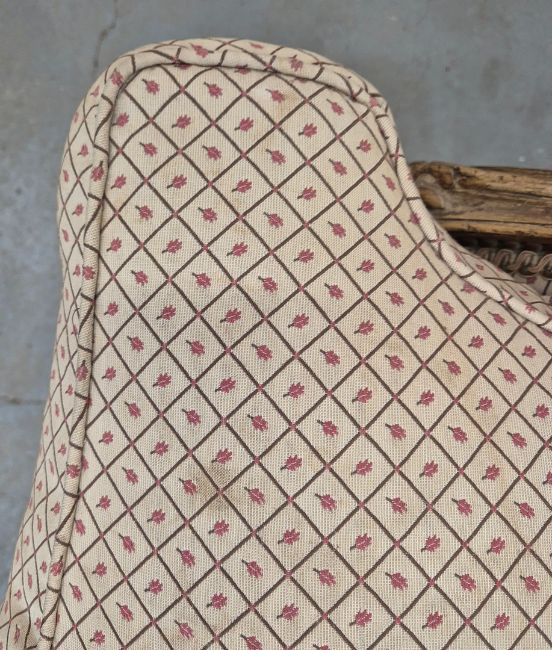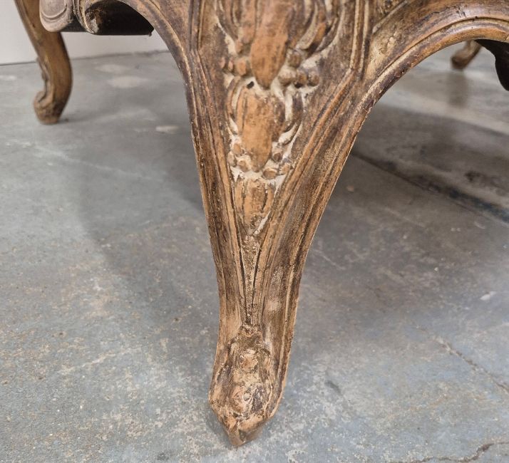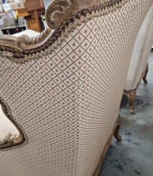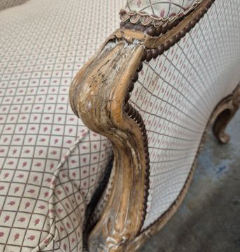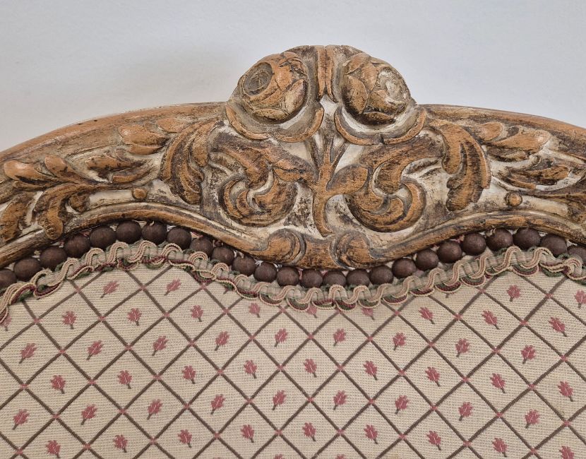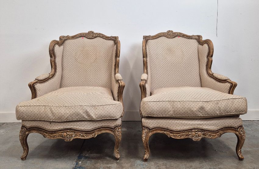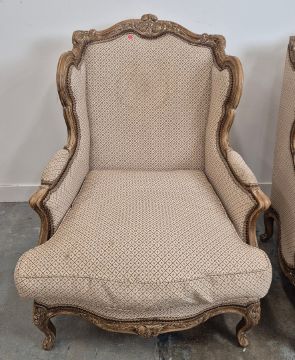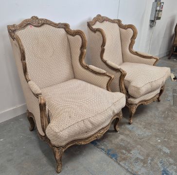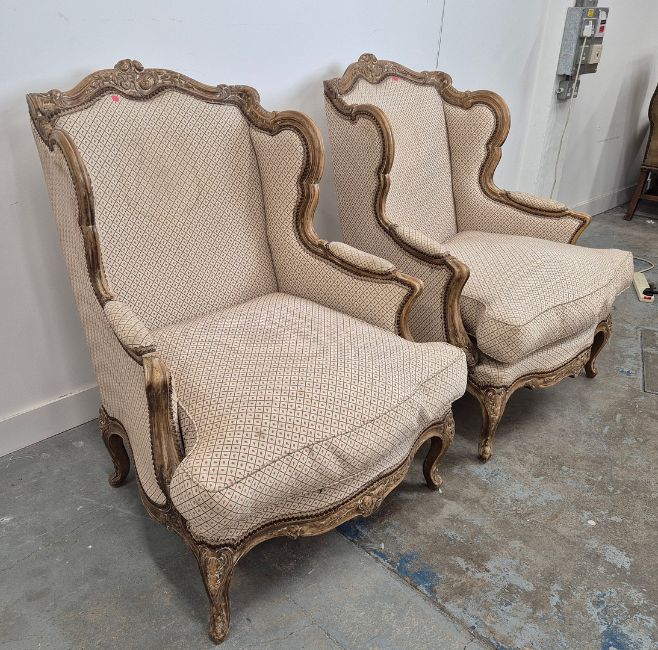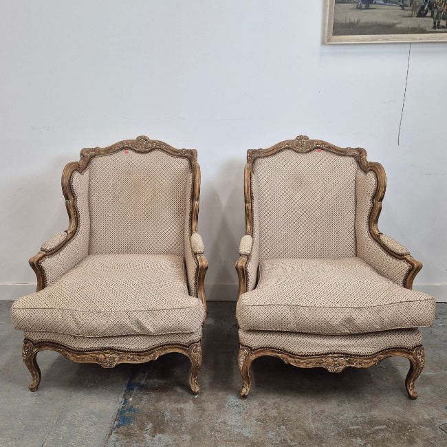 BERGERES A OREILLES. A PAIR. Louid XV style with carved show show frames, cabriole supports an patterned upholstery each approx. 82cm w x 97cm t.