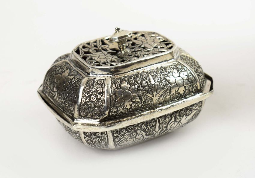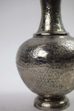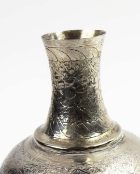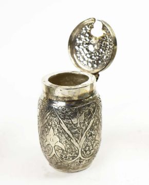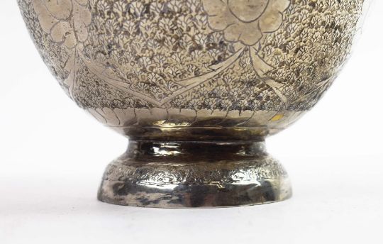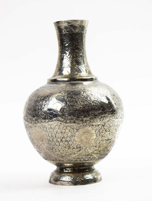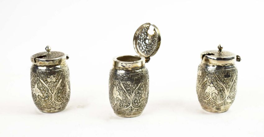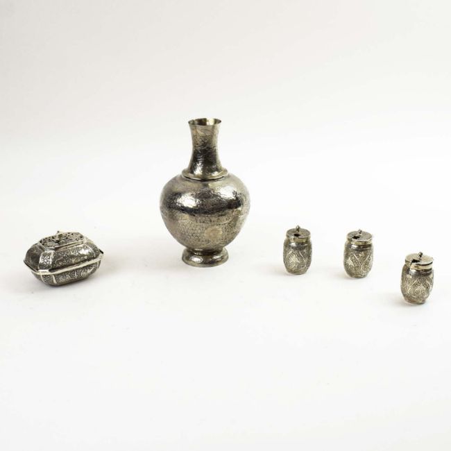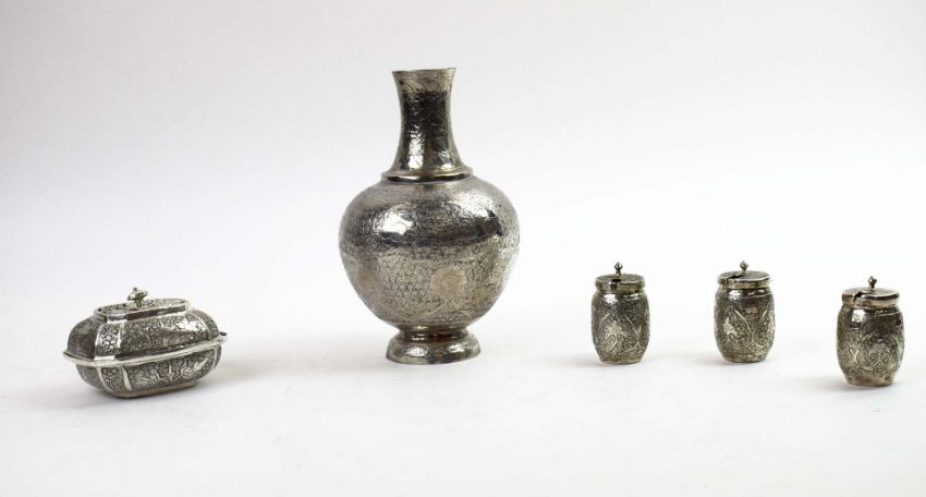 A COLLECTION OF INDIAN WHITE METAL WARE. probably late 19th century, comprising a baluster vase, a soap dish and three condiment pots, each piece with elaborately chased decoration, the vase measuring 20cm high, total weight 685 grams (5).