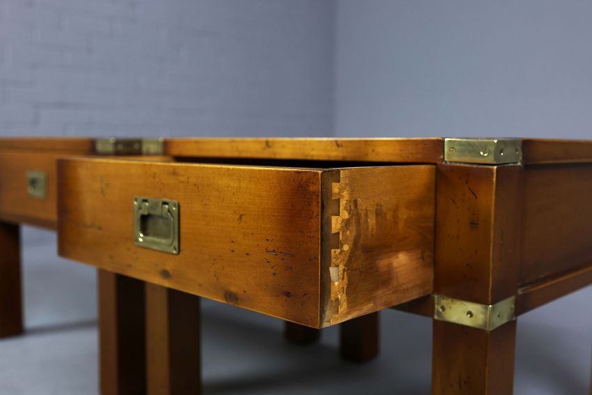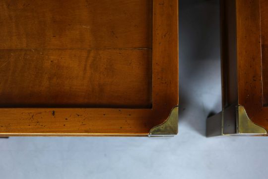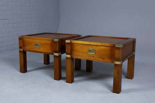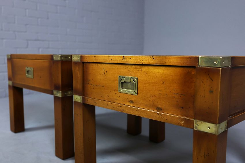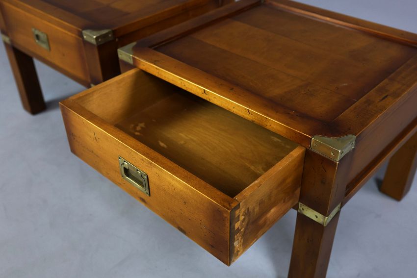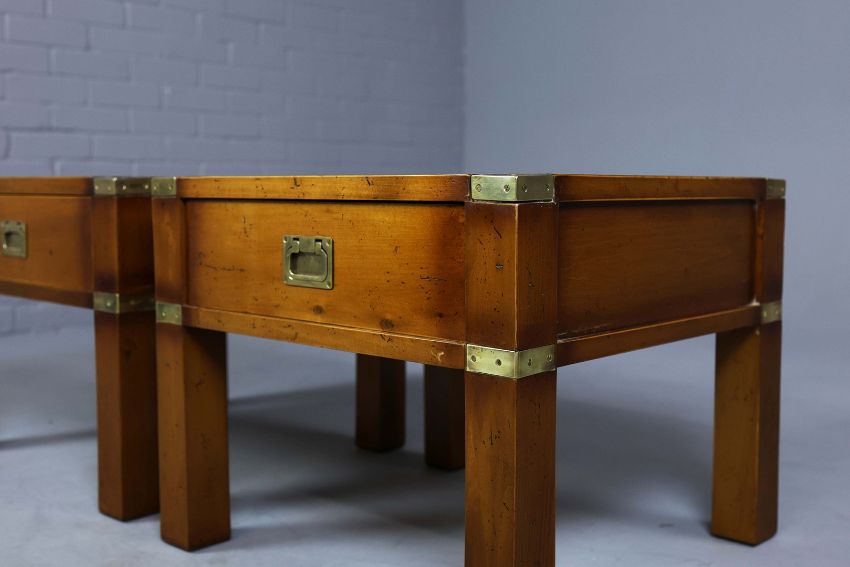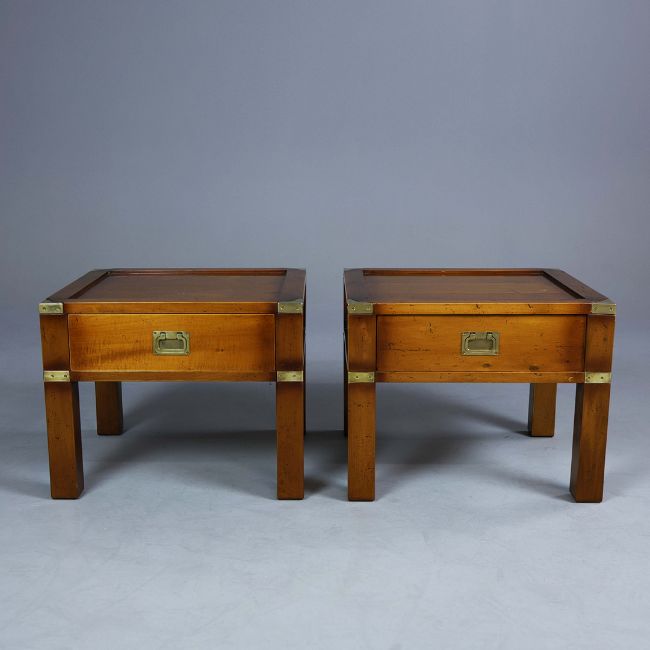 PAIR OF CAMPAIGN STYLE LAMP TABLES (2). Cherrywood and brass bound, each with single drawer, 43cm H x 54cm W x 50cm D.