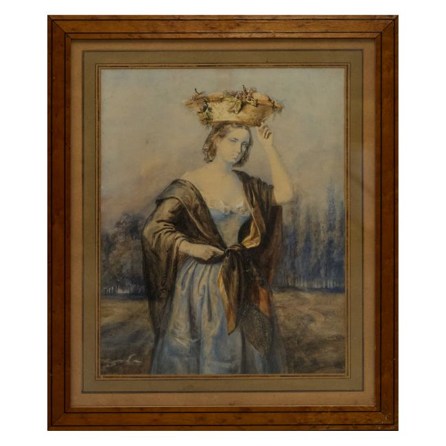 19TH CENTURY BRITISH SCHOOL. LADY CARRYING BASKET OF FRUIT. watercolour, dated 1826, 43cm x 36cm, framed.