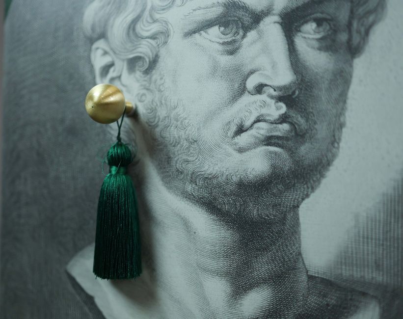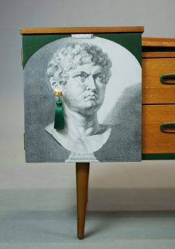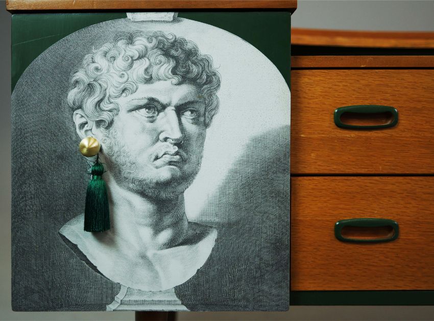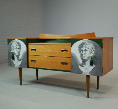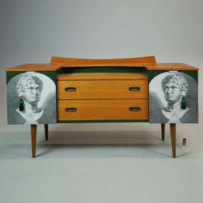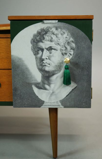 THE EMPEROR'S EARRINGS SIDEBOARD BY ARTEMISIA'S TALES. with two drawers and two doors depicting the Roman Emperor Nero, 74cm H x 138cm W x 43cm D.