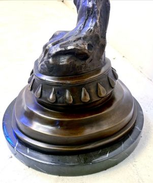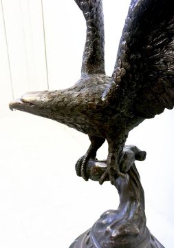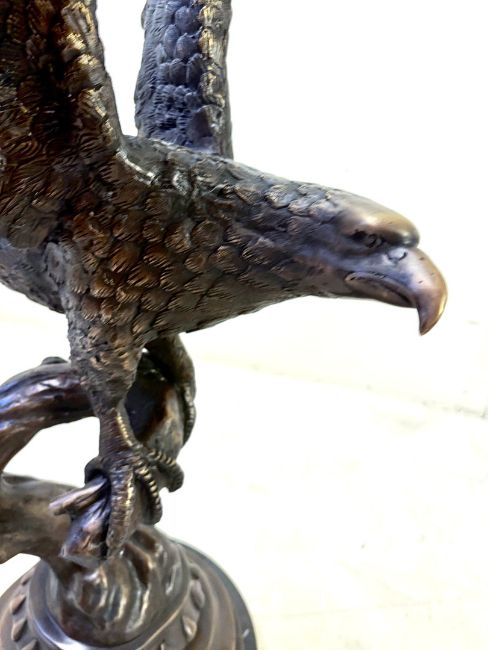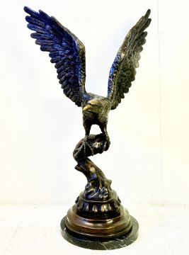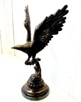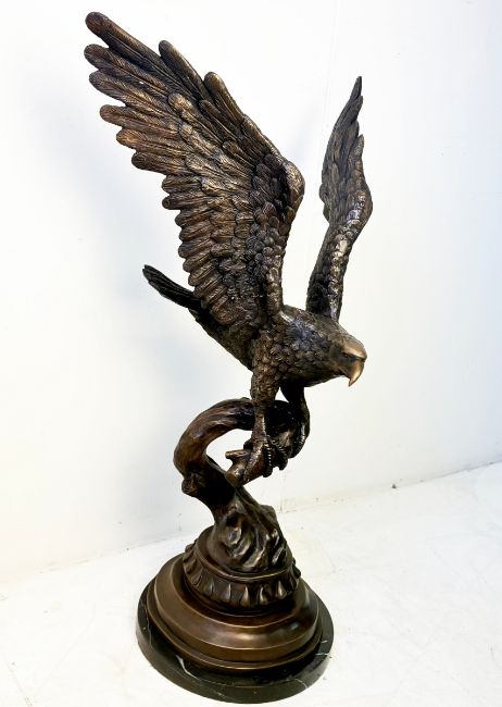 CONTEMPORARY SCHOOL BRONZE SCULPTURE OF AN EAGLE TAKING FLIGHT ON A MARBLE BASE. 80cm H x 50cm W.