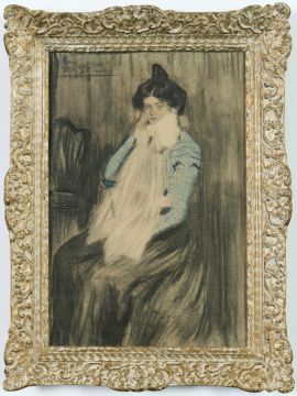 PABLO PICASSO. LOLA – PICASSO’S SISTER. (d) pochoir: suite: Bleus De Barcelone 1963, numbered edition of 500, signed in the plate, printed by Jacomet, published by Au Vent d’Arles, French Montparnasse frame 42cm x 29cm. (Subject to ARR – see Buyers Conditions).