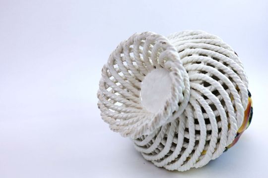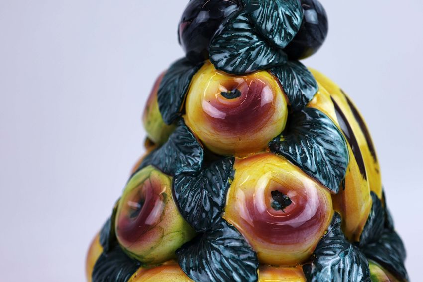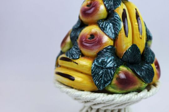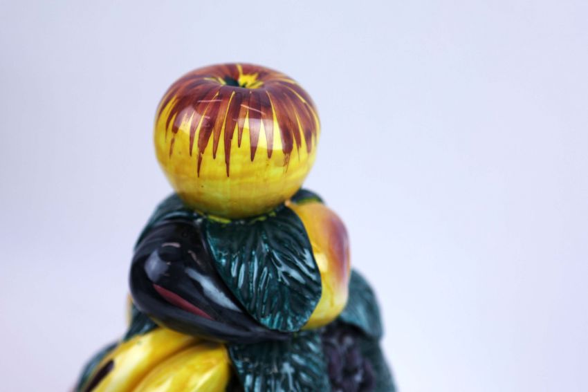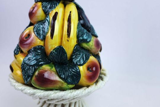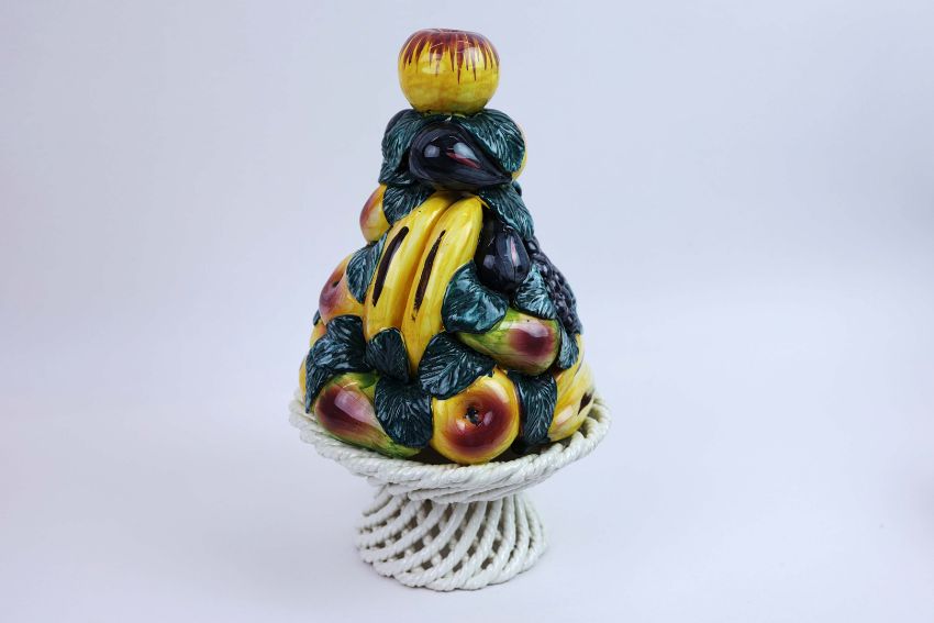 CASA PUPU STYLE. ITALIAN MAJOLICA FRUIT CENTRE PIECE. Ceramic in Polychrome painted glaze on "rope" twist base, 41 cms high.