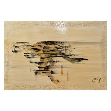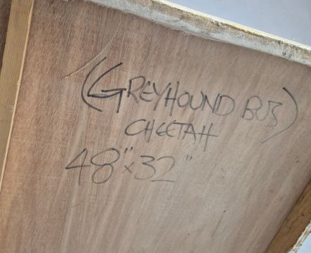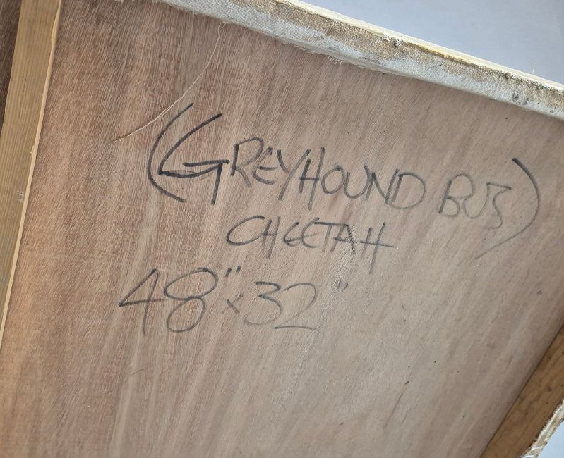 JAN COUTTS. GREYHOUND BUS CHEETAH. Oil on Board, 81cms x 123cms, signed, signed and inscribed verso.