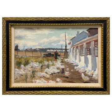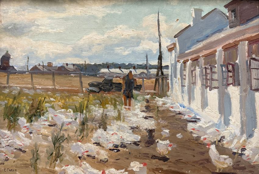 SERGEI ZAKHAROVICH GATIN (RUSSIAN, 1923-2001). FEEDING THE CHICKENS. oil on board, 43cm x 58cm, framed.