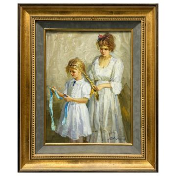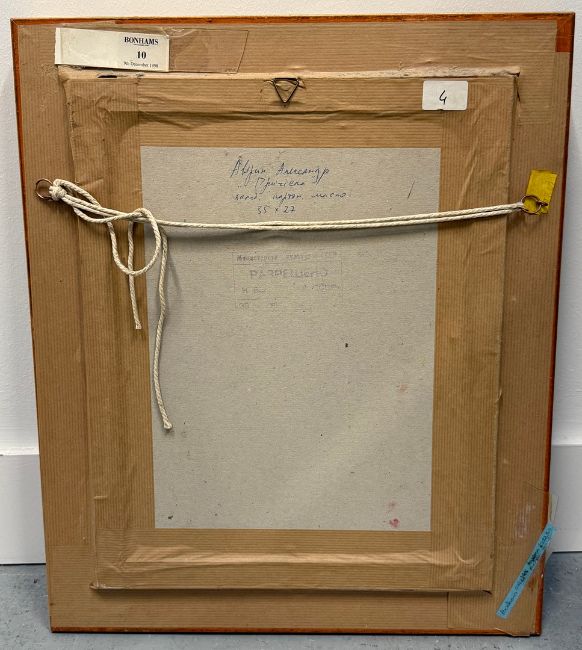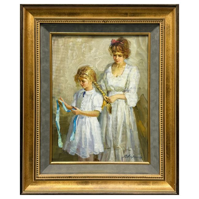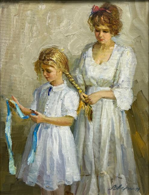 ALEXANDER AVERIN (RUSSIAN B. 1952). PLAITING THE HAIR. oil on board, 49cm x 41cm, framed.