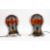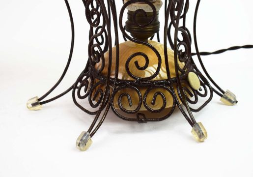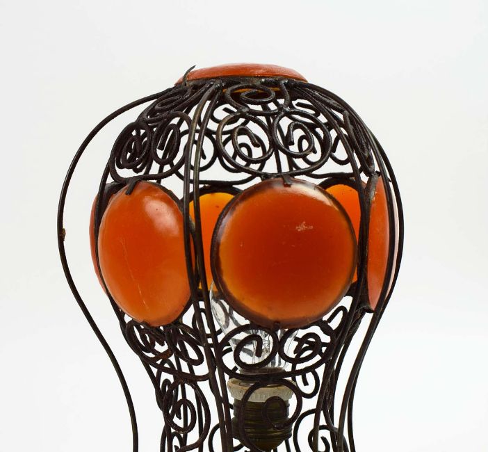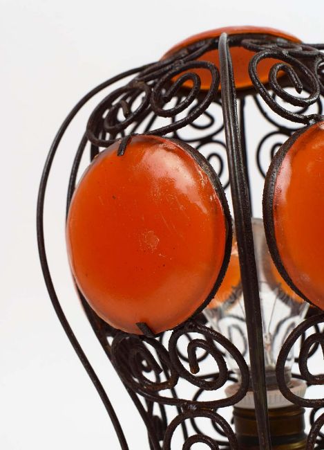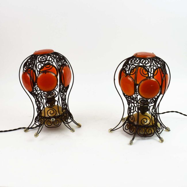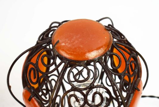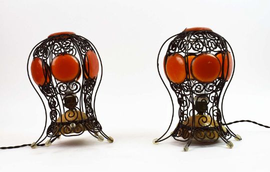 PAIR OF MOROCCAN WROUGHT METAL TABLE LAMPS WITH ORANGE RESIN SHADES. 32cm H x 26cm W.