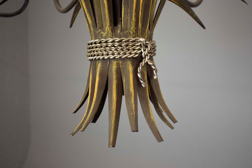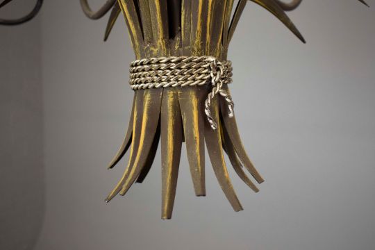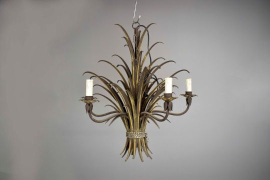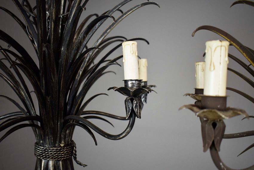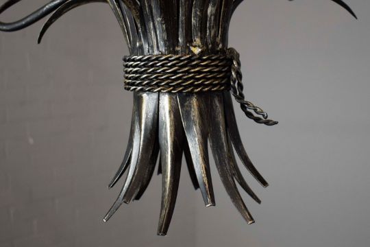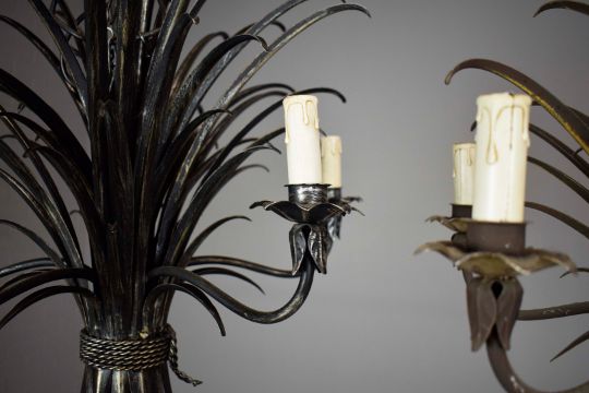 MAISON JANSEN STYLE WHEATSHEAF STYLE CHANDELIERS, A NEAR PAIR. black finished metal with gilt accents, 65cm drop at largest approx. not including chains. (2).