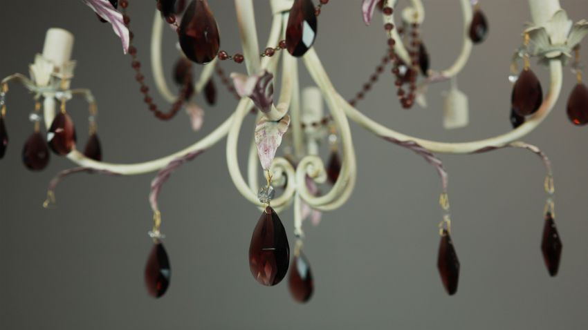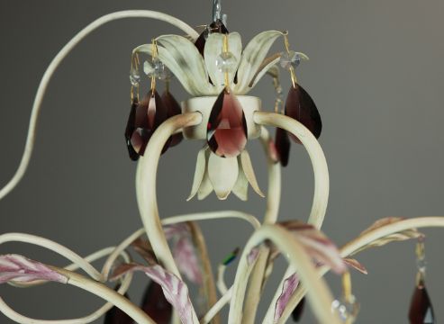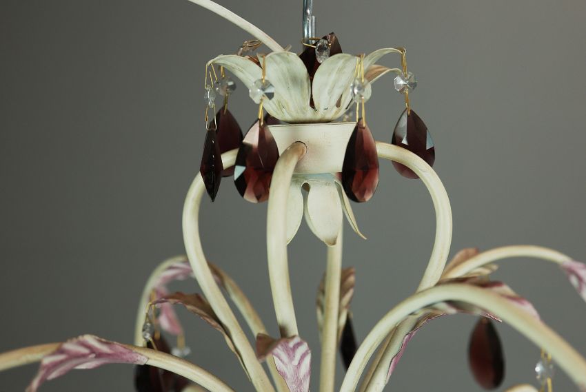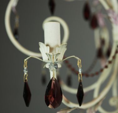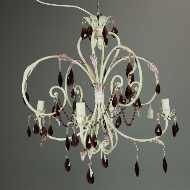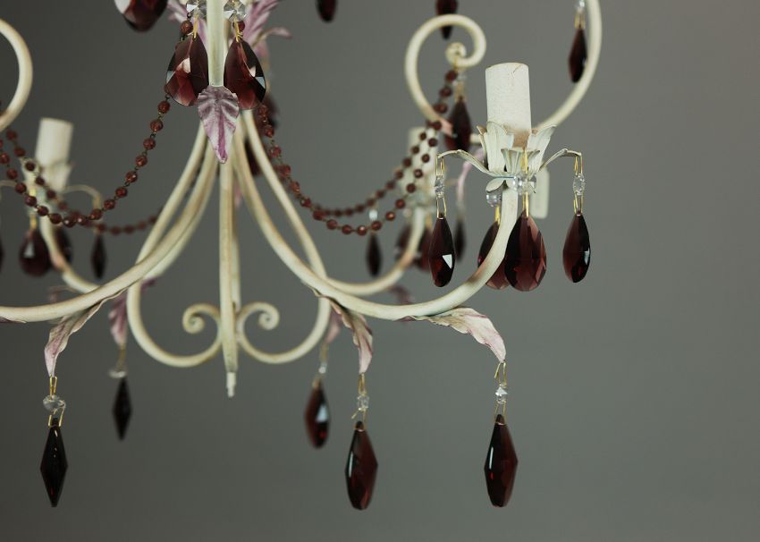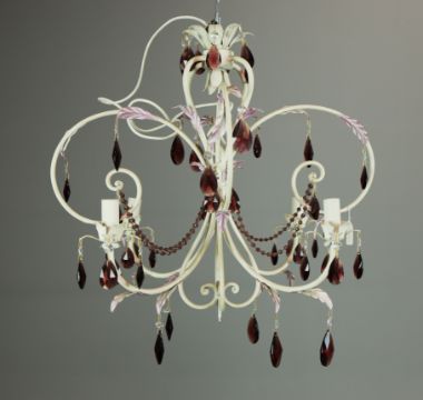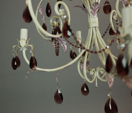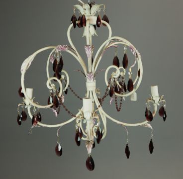 EURO LAMP ART CHANDELIER. white painted with purple droplet and bead detail, approx. 58cm drop not including cable., 63cm diam. approx.